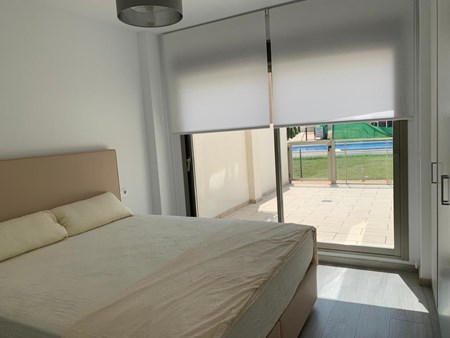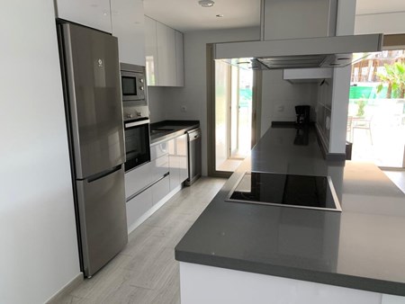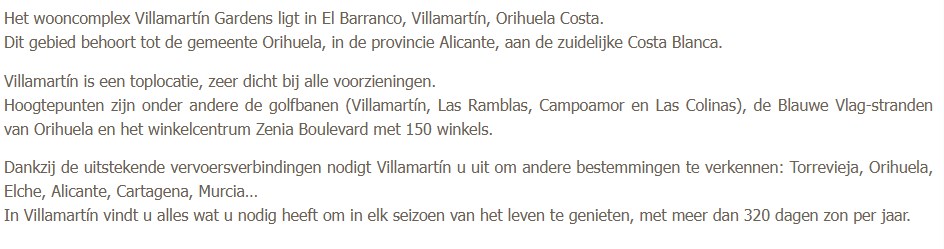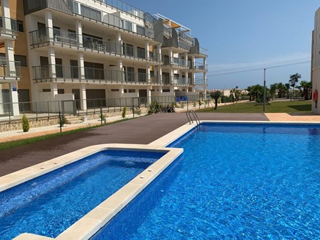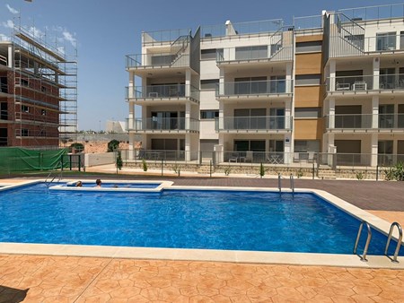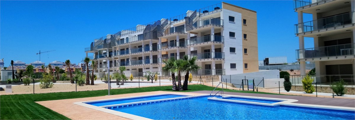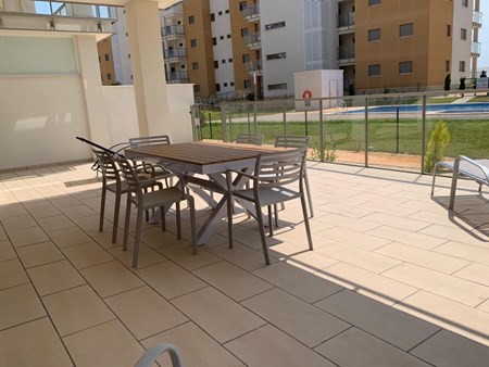 Aan de Costa Blanca op een dikke 2 uur vliegen vanuit Oostende, Lille, Antwerpen, Chareloi of Brussel en 40 minuten rijden vanuit de luchthaven van Alicante of Murcia verkopen we een gelijkvloers apprtement in een mooie nieuwe gemeenschap. Het apprtement is met haar terras een paar trapjes hoger gelegen dan de gmeenschappelijke tuin. Vlakbij één van de drie zwembaden met jacuzzi. er is één zwembad verwarmd voor tijdens de winter.